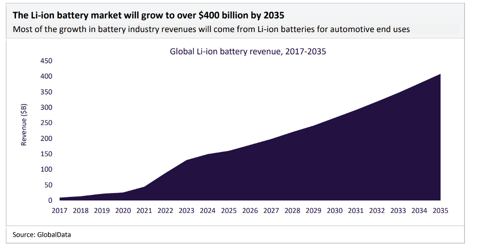 An energy transition is sweeping the globe. The electric vehicle (EV) industry and worldwide battery market are experiencing unprecedented growth alongside it. The lithium-ion (Li-ion) battery industry will reach over $400bn in value by 2035 according to GlobalData research, up from just under $90bn in 2022. It amounts to a robust 12.5% compound annual growth rate (CAGR). Soaring demand for clean mobility solutions is the key driver. The ascent of EVs – both passenger cars and commercial vehicles – will underpin the Li-ion battery sector’s expansion over the next decade. McKinsey forecasts that mobility applications will command at least 90% of battery demand by 2030. GlobalData’s projections are equally grand, with EV production expected to reach 17.3 million units by 2025 – 18.4% of total light vehicle production. By 2028, this figure is anticipated to escalate to 28.3 million units, accounting for 28% of production. Growth will only continue into the 2030s.